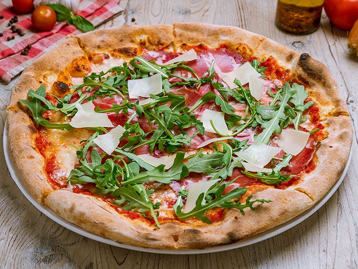Prosciutto is a type of thinly sliced cured ham that originated in Italy. In this recipe, it is accompanied by red pasta sauce, mushrooms, tomatoes, fresh arugula, and mozzarella and parmesan cheeses.